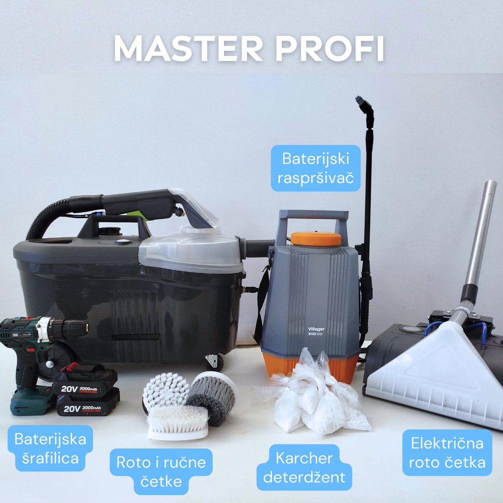 Master Profi se može iznajmiti sa električnom valjak četkom, ukoliko želite da perete tepihe, ili bez nje i tada koristi mlaznice od 11cm i 24cm.